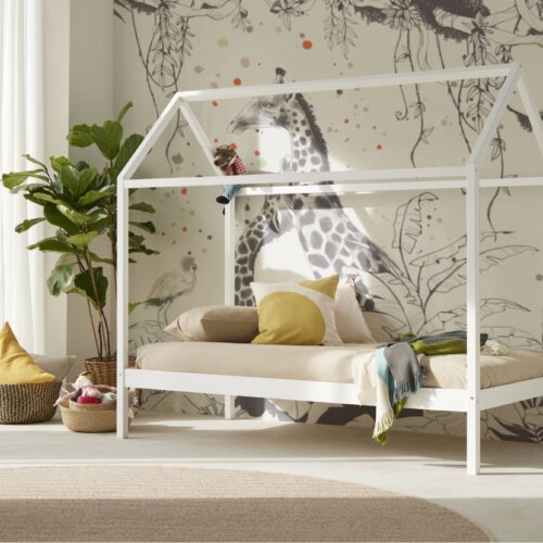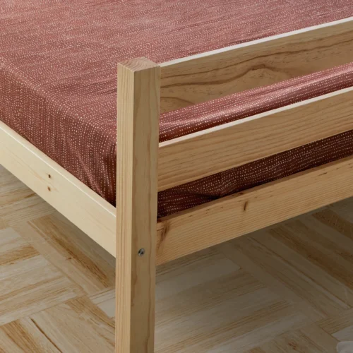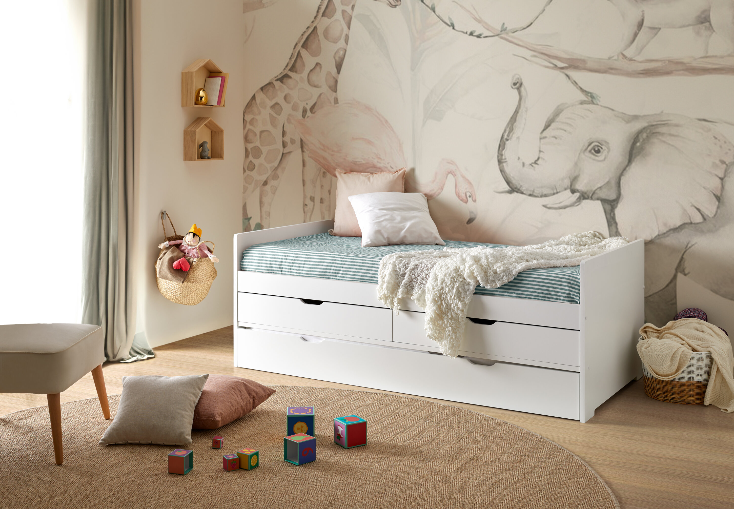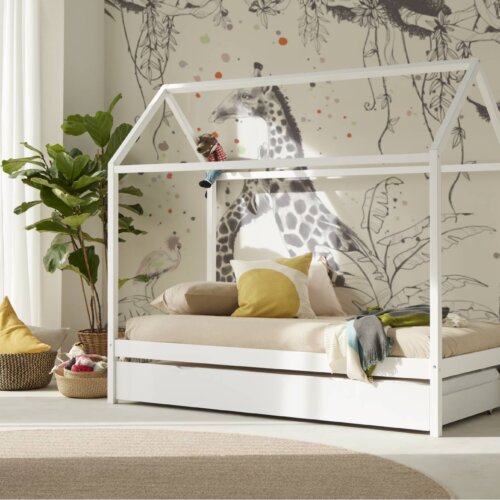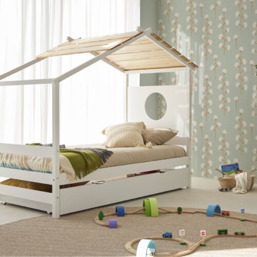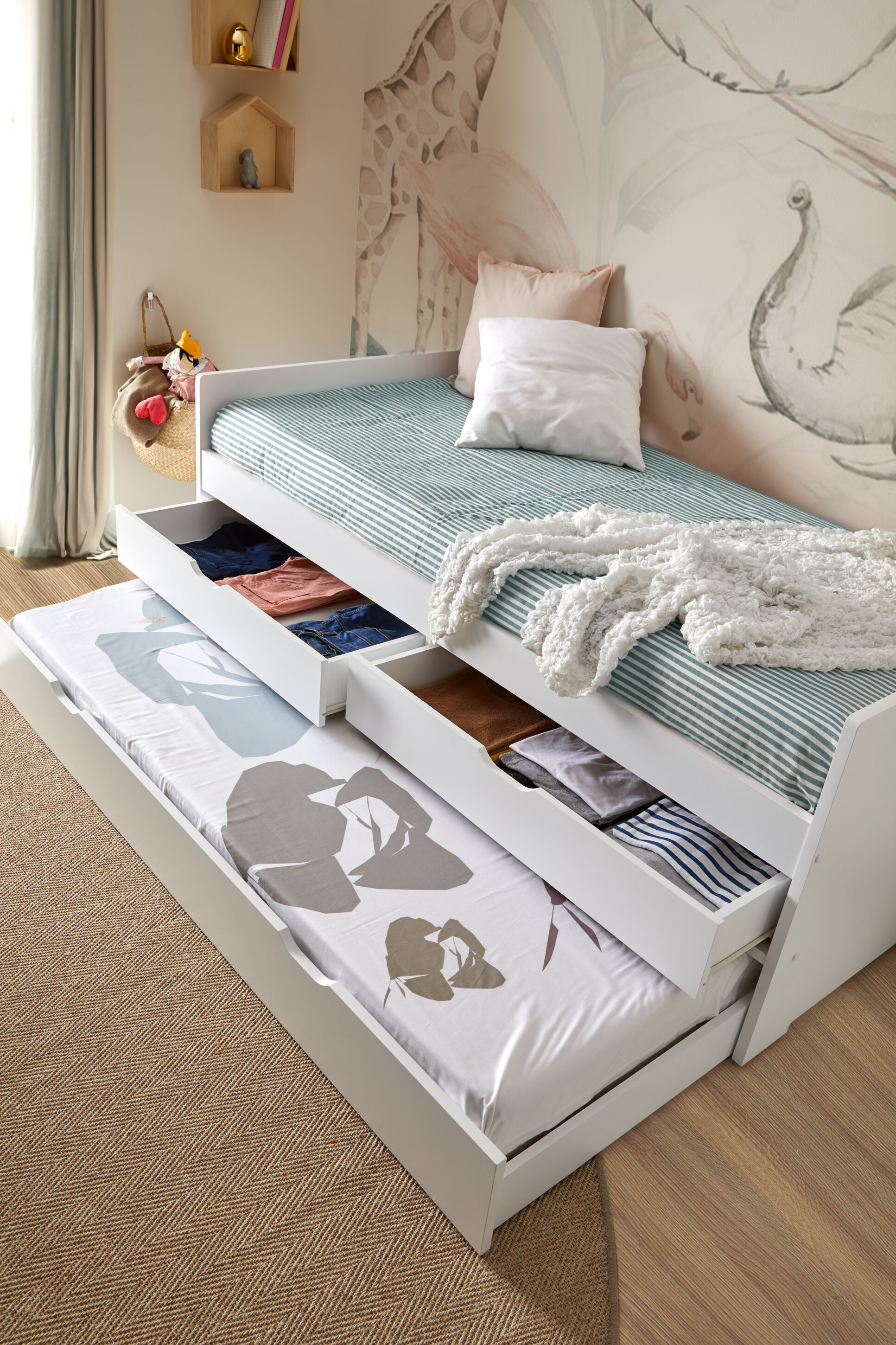 Cama nido de madera con triple función: cama diaria, segunda cama deslizante y dos cajones integrados para tenerlo todo a mano. Bordes redondeados y laterales protectores que abrazan. Hecha en España, luminosa y práctica. Libera espacio y mantiene el cuarto en calma.