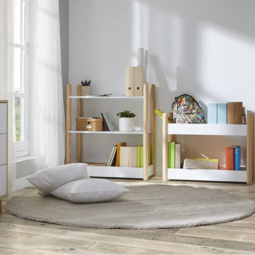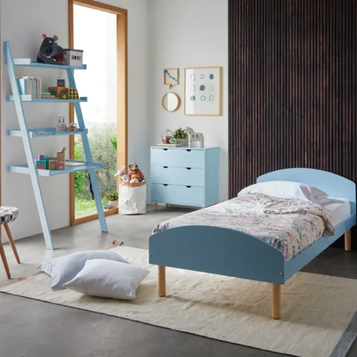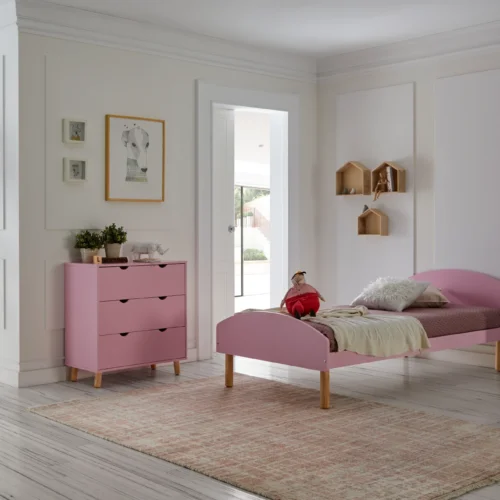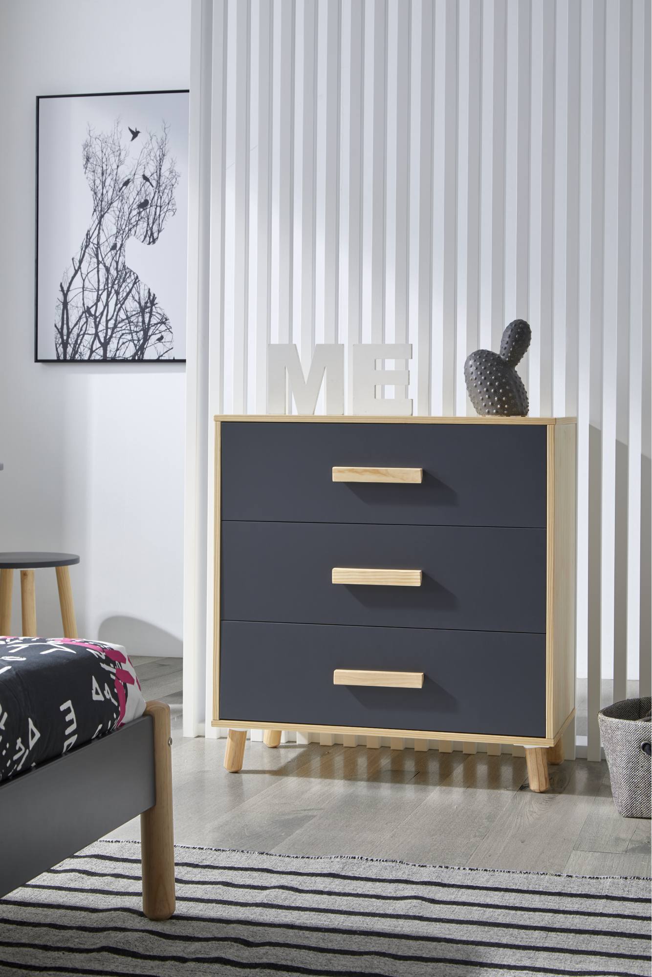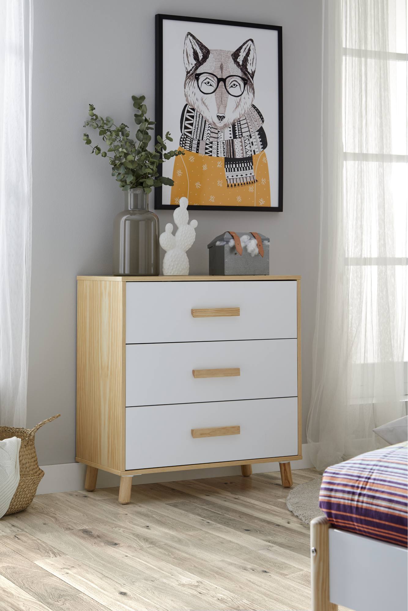 Tres cajones que ordenan sin esfuerzo. Cuerpo de pino natural, frentes blancos mate y tiradores de madera agradables al tacto. Patas altas para limpiar fácil. Hecha en España con mimo y materiales responsables. Un básico bonito para dormitorios infantiles y juveniles.