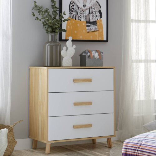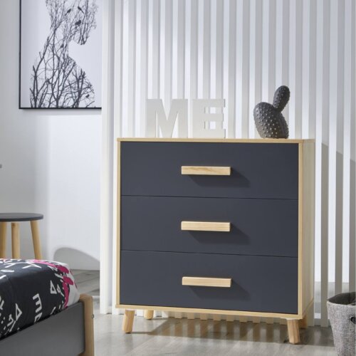 Líneas limpias, blanco mate que combina con todo o azul cielo para iluminar. Patas de madera que dan ese toque cálido. Tres cajones con apertura suave para tenerlo todo a mano. Fabricación española y materiales responsables. Una cómoda serena y práctica que encaja en cuartos infantiles y juveniles.