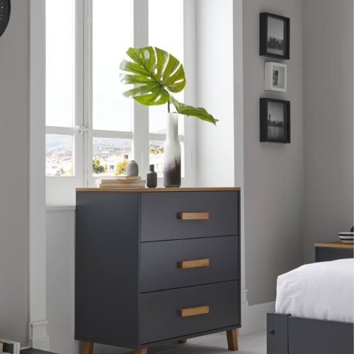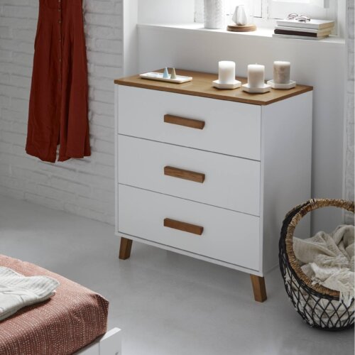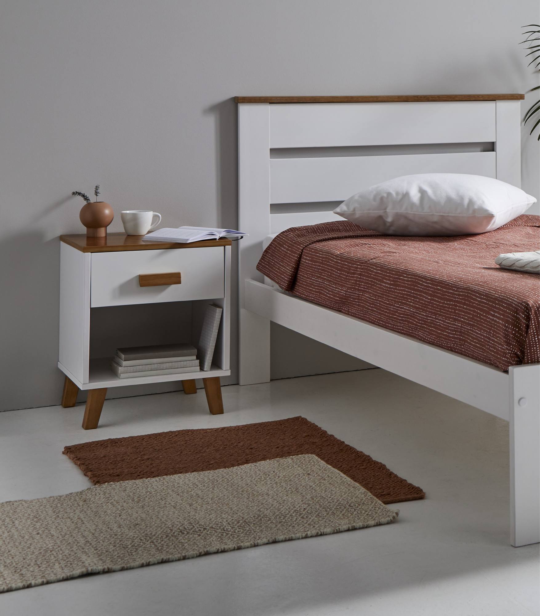 Mesita de noche de madera con tapa y detalles en roble, cuerpo blanco mate y patas altas que facilitan la limpieza. Un cajón suave y un hueco abierto para libros y pequeños tesoros. Hecha en España con materiales responsables. Diseño nórdico, cálido y muy práctico.